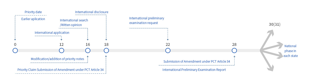 This is a system of filing a PCT application to the Patent Office (Receiving Office) of the country of origin or the country of residence in which the patent is filed, and then entering the national phase into the country (Designated (Selected) State) in which an applicant wants to obtain a patent within a specified period. The PCT international filing date can be recognized as the filing date in the designated country. However, in the case where the application is filed claiming priority of the prior application, a priority claim may be recognized when a PCT international application is filed within 12 months from the filing date of the earlier application.